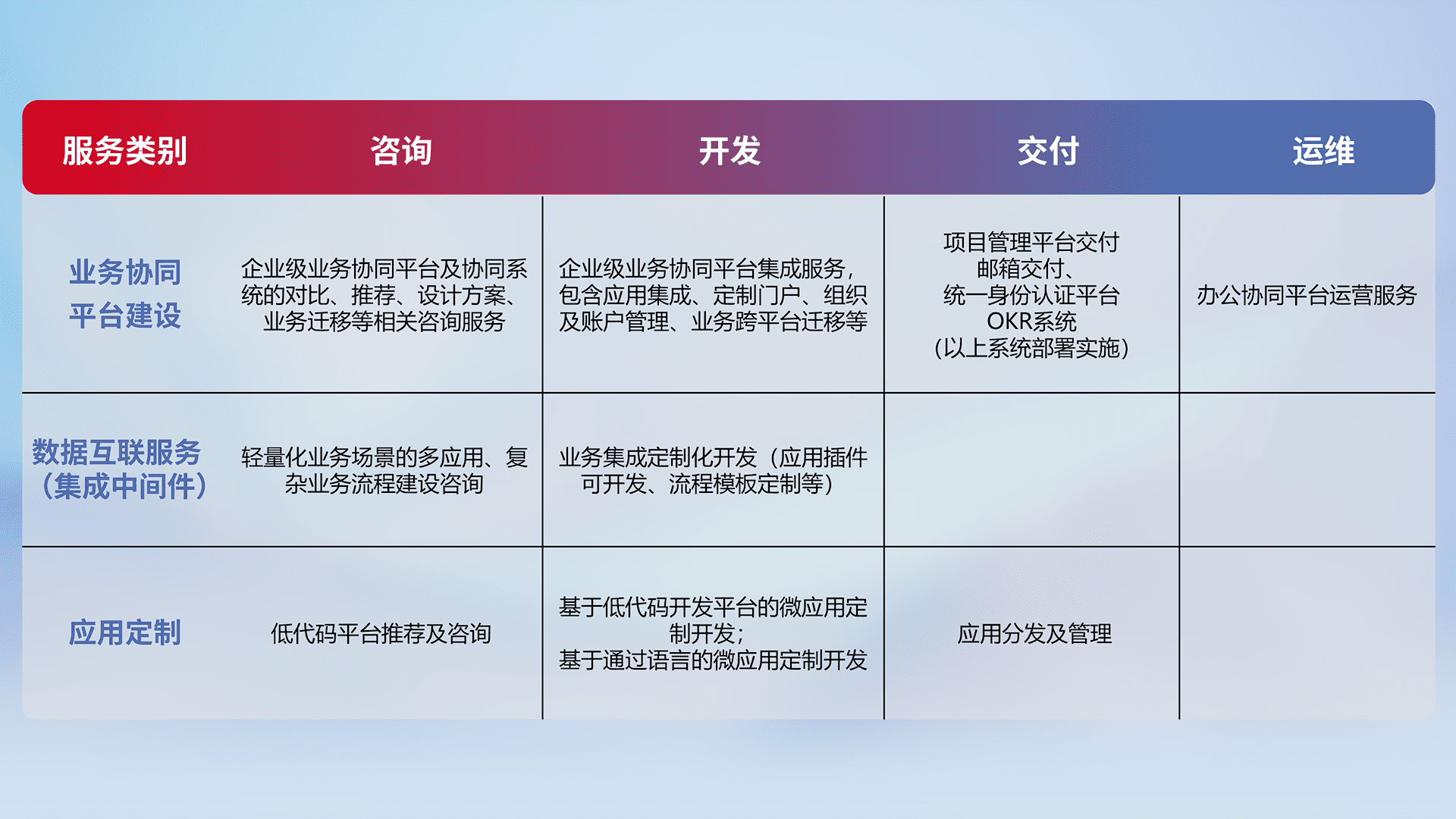 针对钉钉、、、、企微、、、、IDaas等平台级产品提供产品的规划、、方案、、、、交付、、、定制化开发等服务,,实现如统一协同办公、、、智能客户服务、、混合会议管理、、、智能数据查询、、、等业务场景,,,实现数字化转型。。。