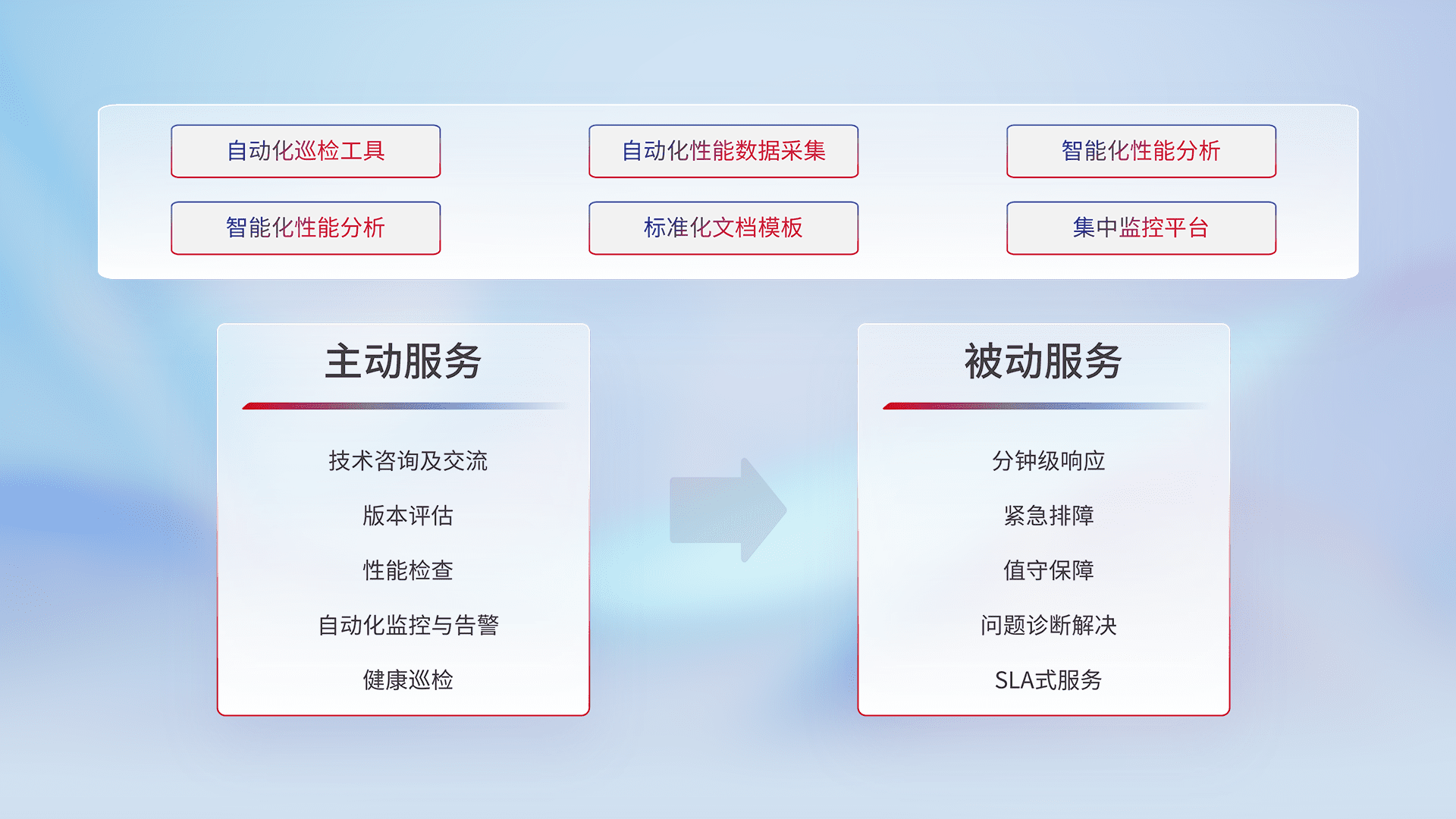 智能化工具和标准化文档,,,保障服务质量,,提供主动服务(包含技术咨询、、、、版本评估、、、性能检查、、自动化监控与告警、、健康巡检)和被动服务包含(分钟级响应、、紧急排障、、、值守保障、、、、问题诊断解决、、、SLA服务)。。。