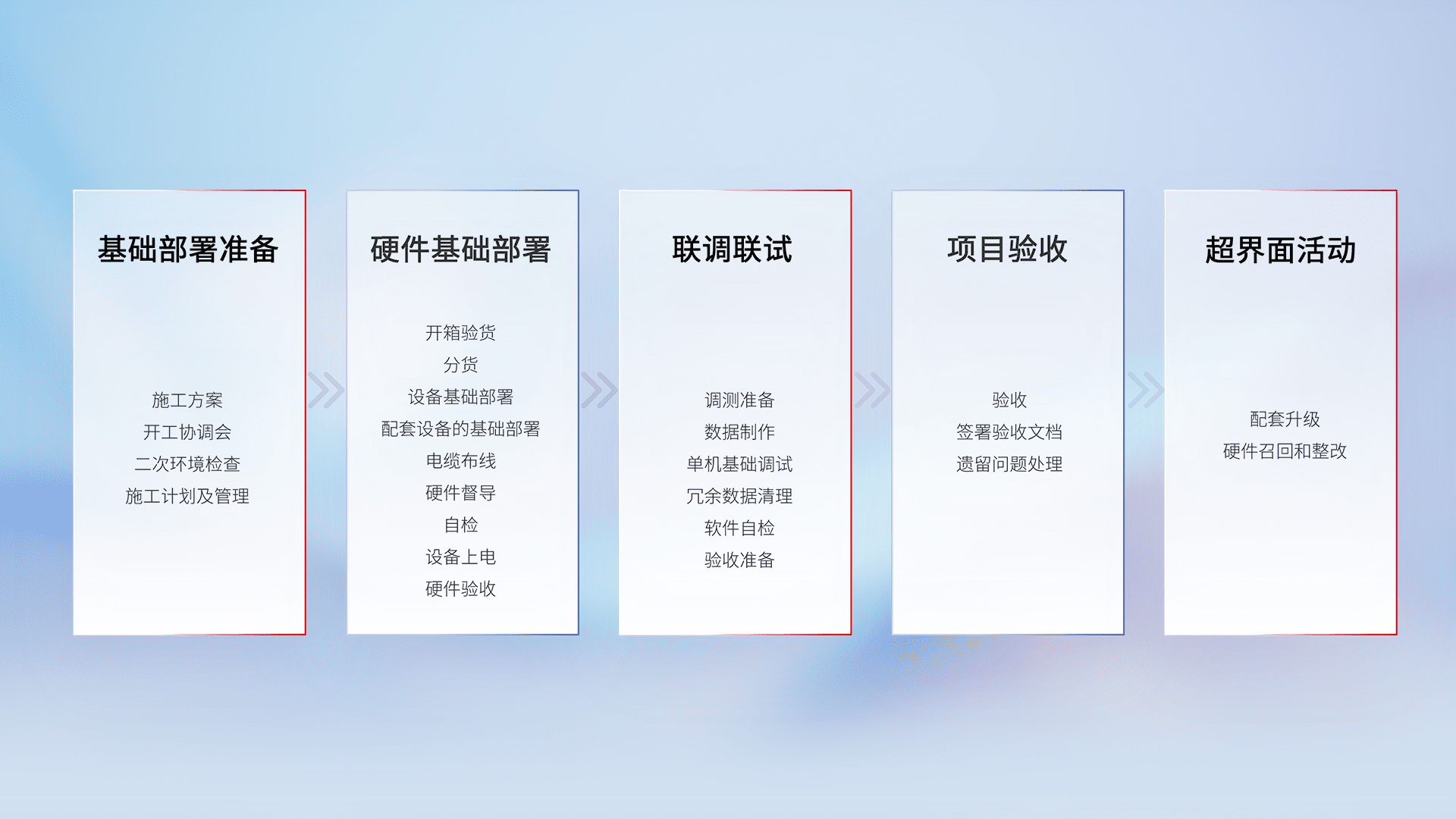 从基础部署准备、、、、硬件基础部署、、、联调联试、、、、项目验收、、越界面活动的全过程可追溯,,,,保证施工质量和进度。。